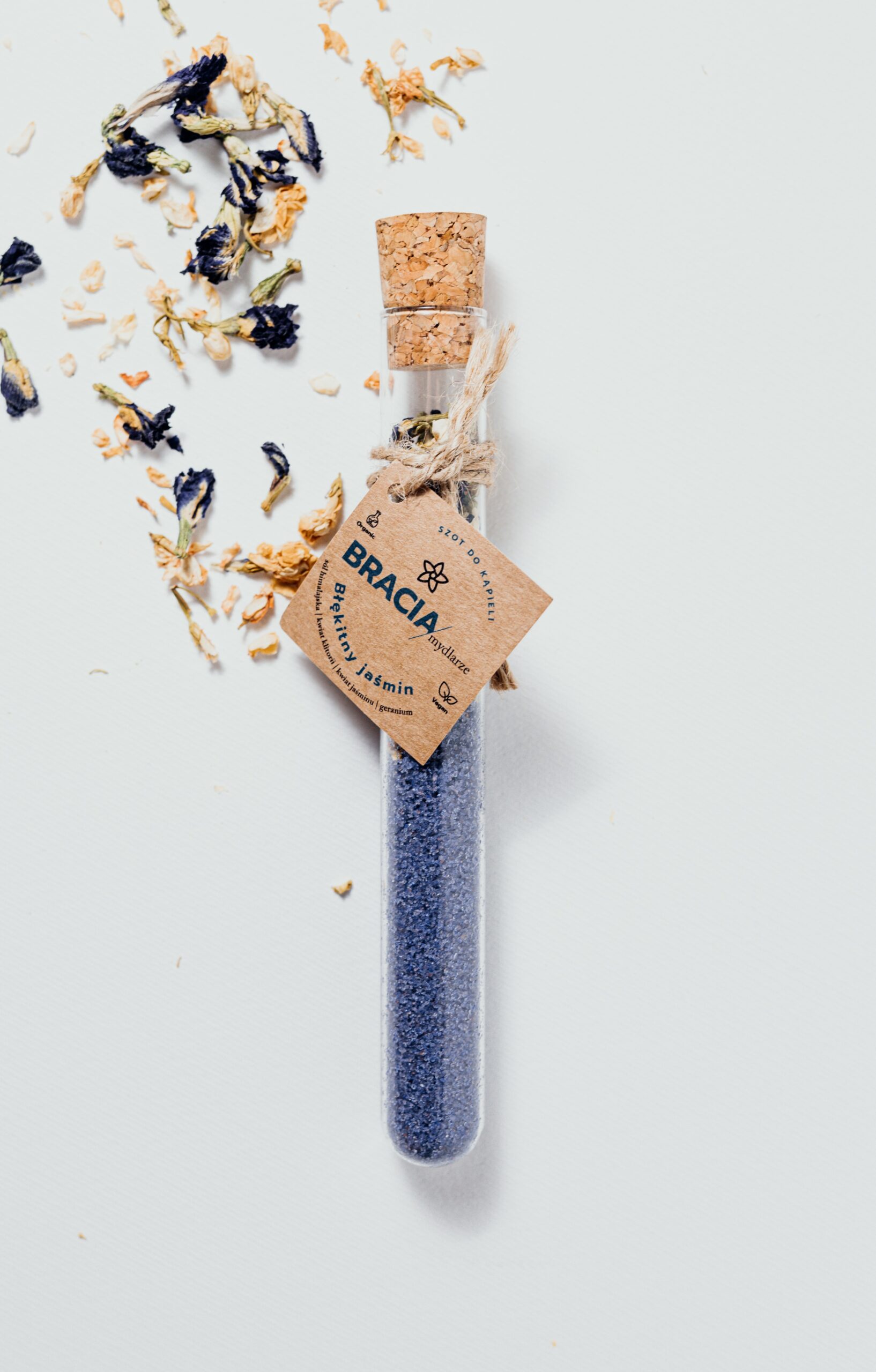 Sól himalajska, kwiat klitorii ternateńskiej, kwiat jaśminu, olejek geraniowy, mica