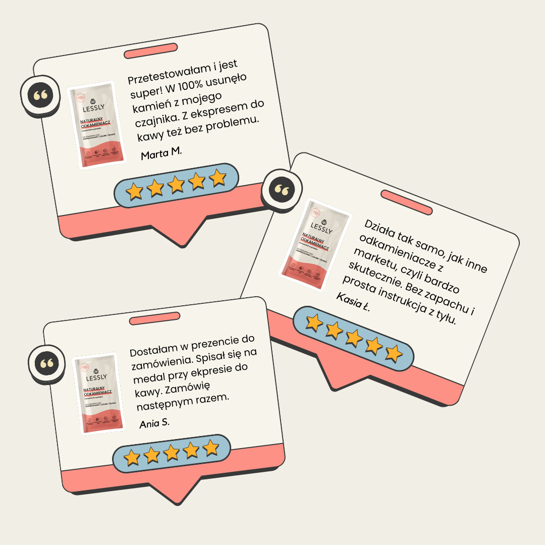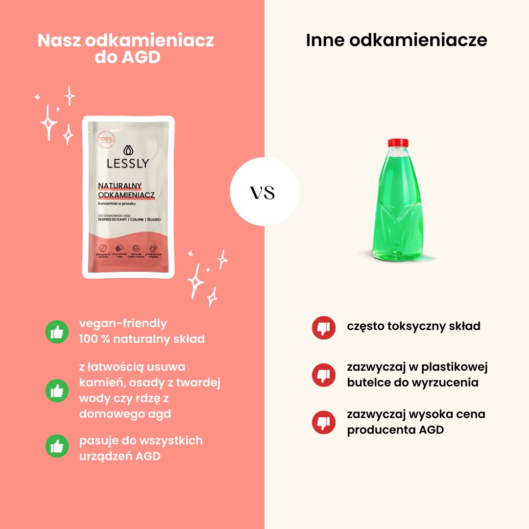 Usuń kamień w 10 minut i chroń swoje urządzenia! Naturalny odkamieniacz do AGD marki Lessly to skuteczny i bezpieczny sposób na pozbycie się osadów z twardej wody, kamienia i rdzy. Dzięki niemu Twój ekspres do kawy, czajnik czy żelazko będą działać dłużej i efektywniej. A wszystko to w duchu zero waste – bez zbędnych chemikaliów i plastikowych opakowań.