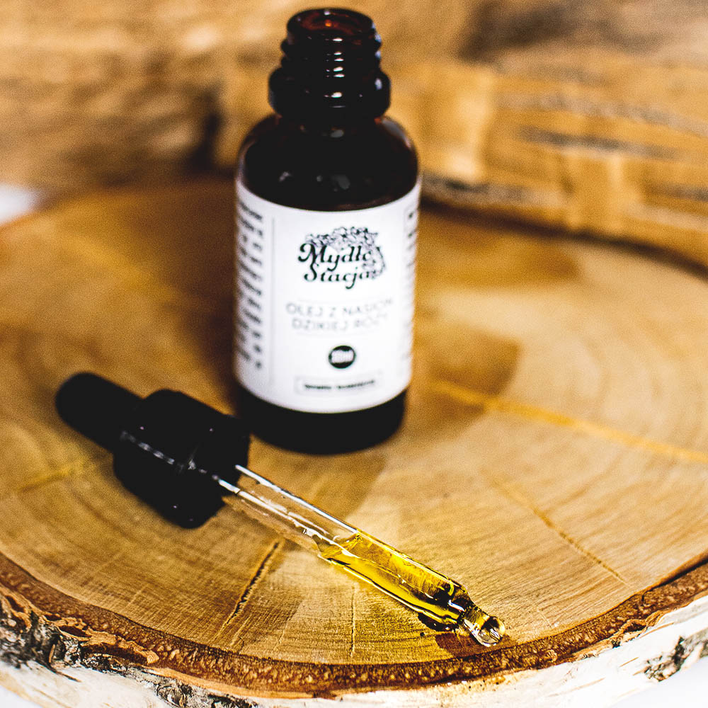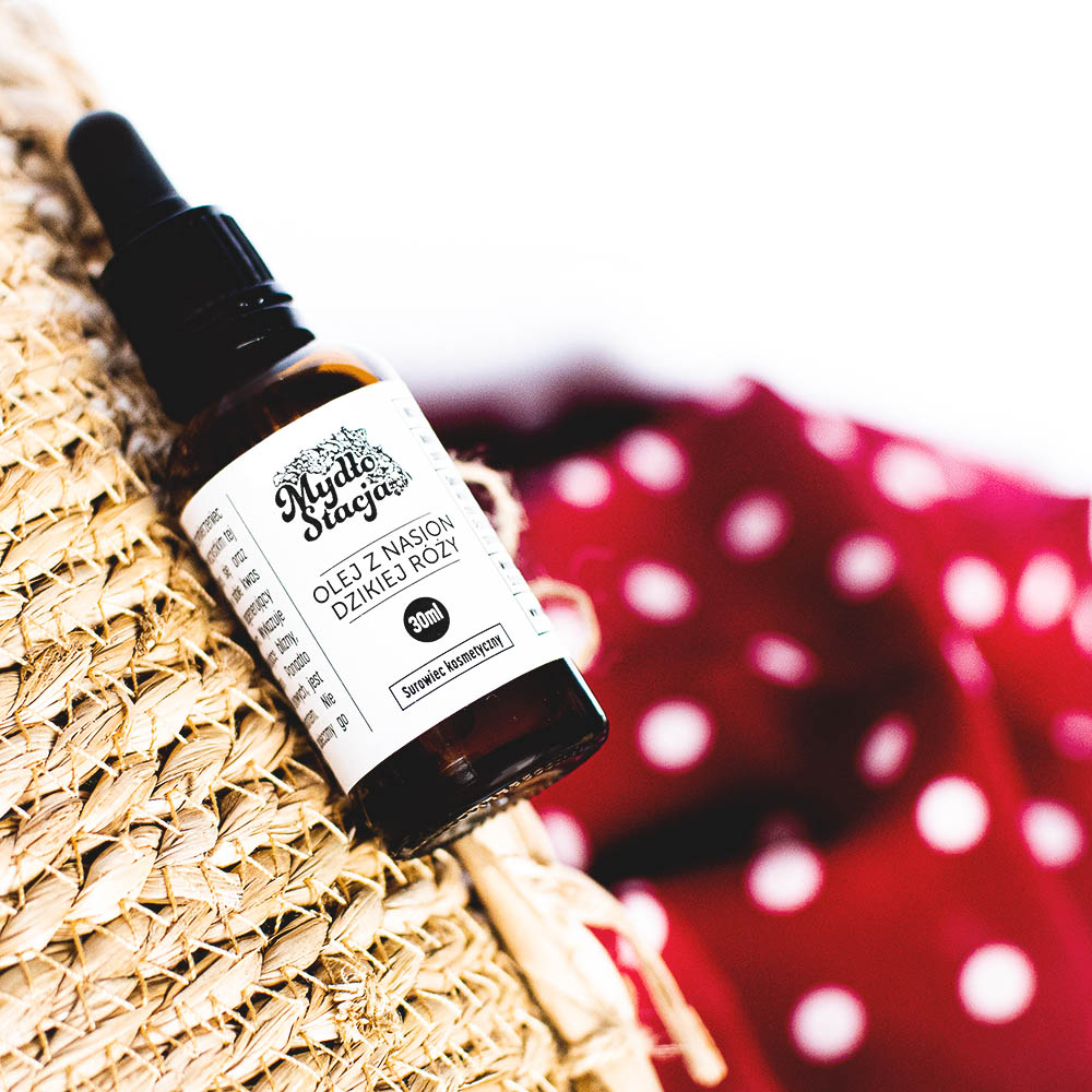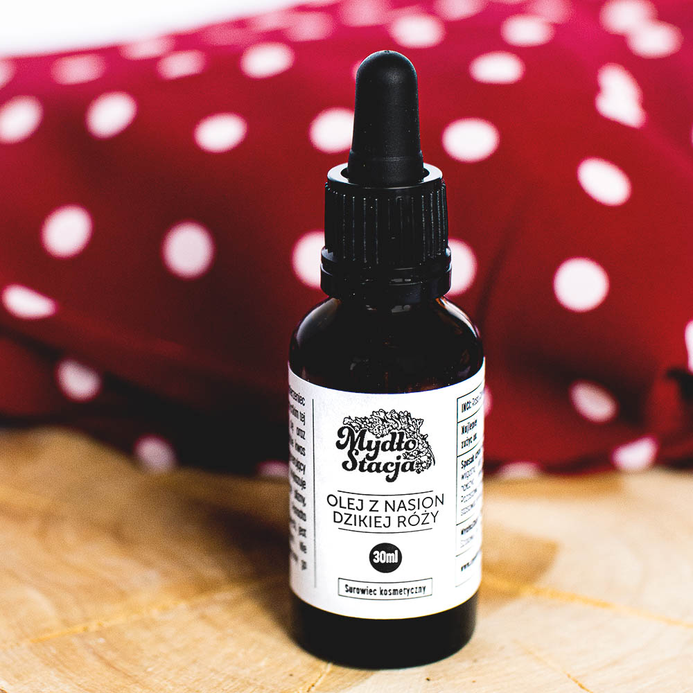 Mydłostacja Olej z pestek dzikiej róży to nierafinowany, tłoczony na zimno olej, który stanowi kwintesencję natury. Bogaty jest w karotenoidy (m. in. beta-karoten, likopen) oraz naturalny kwas trans-retinowy czyli tretynoinę (kwas witaminy A), który stymuluje tkanki do regeneracji, udrażnia ujścia gruczołów łojowych oraz delikatnie złuszcza martwy naskórek. Dodatkowo, w składzie znajdziemy kwas linolowy (44%), kwas a-linolenowy (23,5%) oraz kwas oleinowy (22,35%).