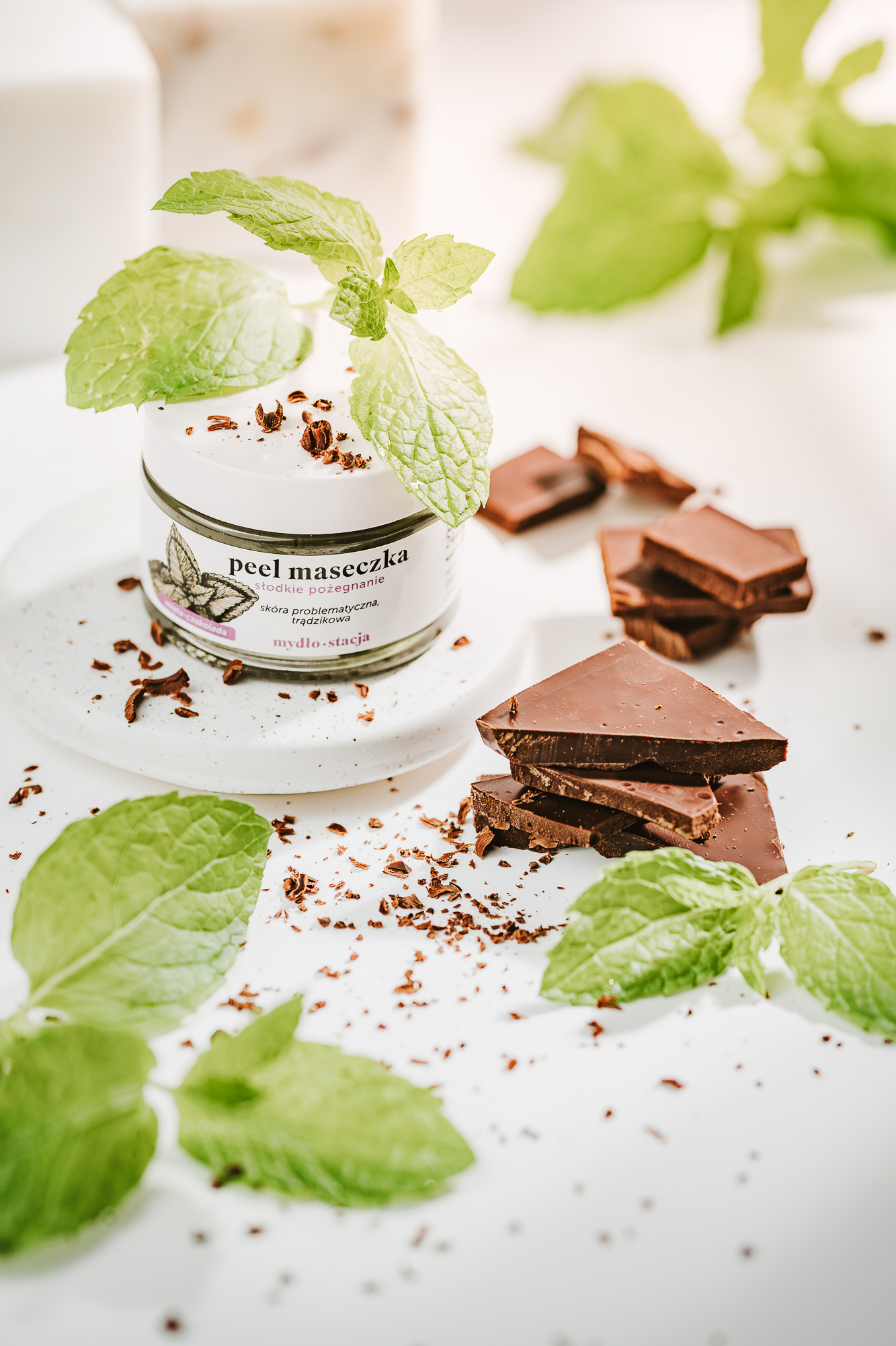 Mydłostacja Peel-Maseczka Słodkie Pożegnanie to sposób na ostateczne rozstanie się z problemami skóry zanieczyszczonej i ze skłonnością do powstawania trądziku. Słodkie połączenie dla mniej słodkich problemów. Wyjątkowe działanie glinki i pielęgnujących olejków, o zapachu miętowej czekolady. Mydłostacja Peel-Maseczka Słodkie Pożegnanie to receptura mająca na celu złagodzenie stanów zapalnych, regulację pracy gruczołów łojowych oraz zmniejszenie niedoskonałości skóry.