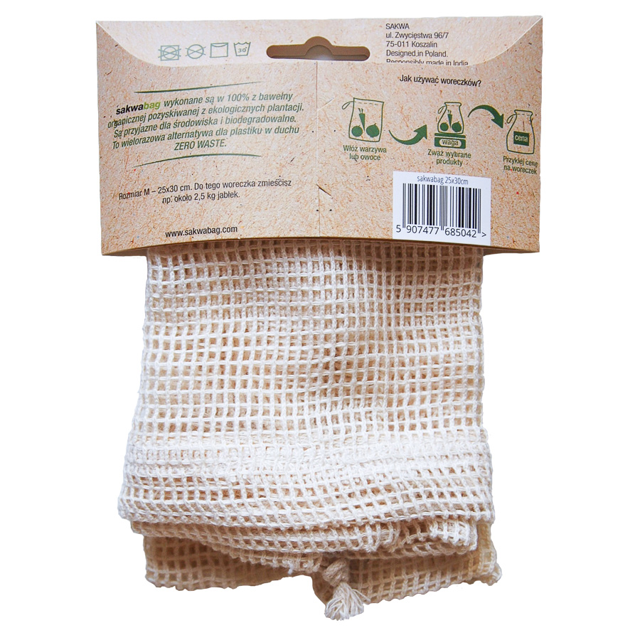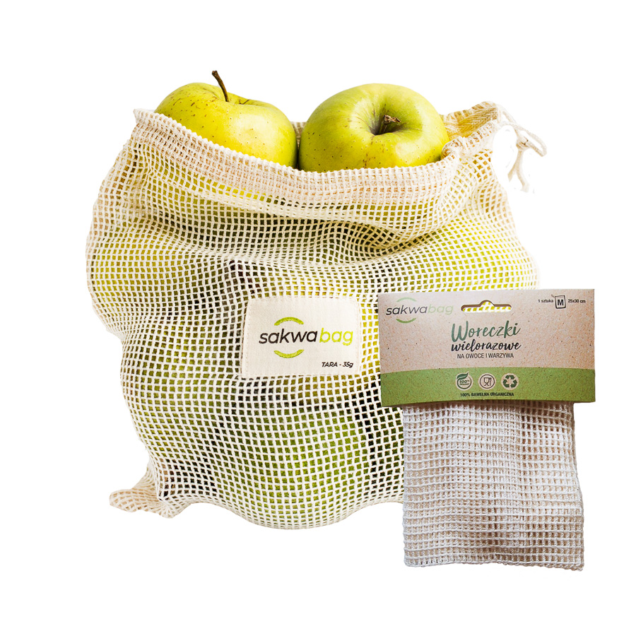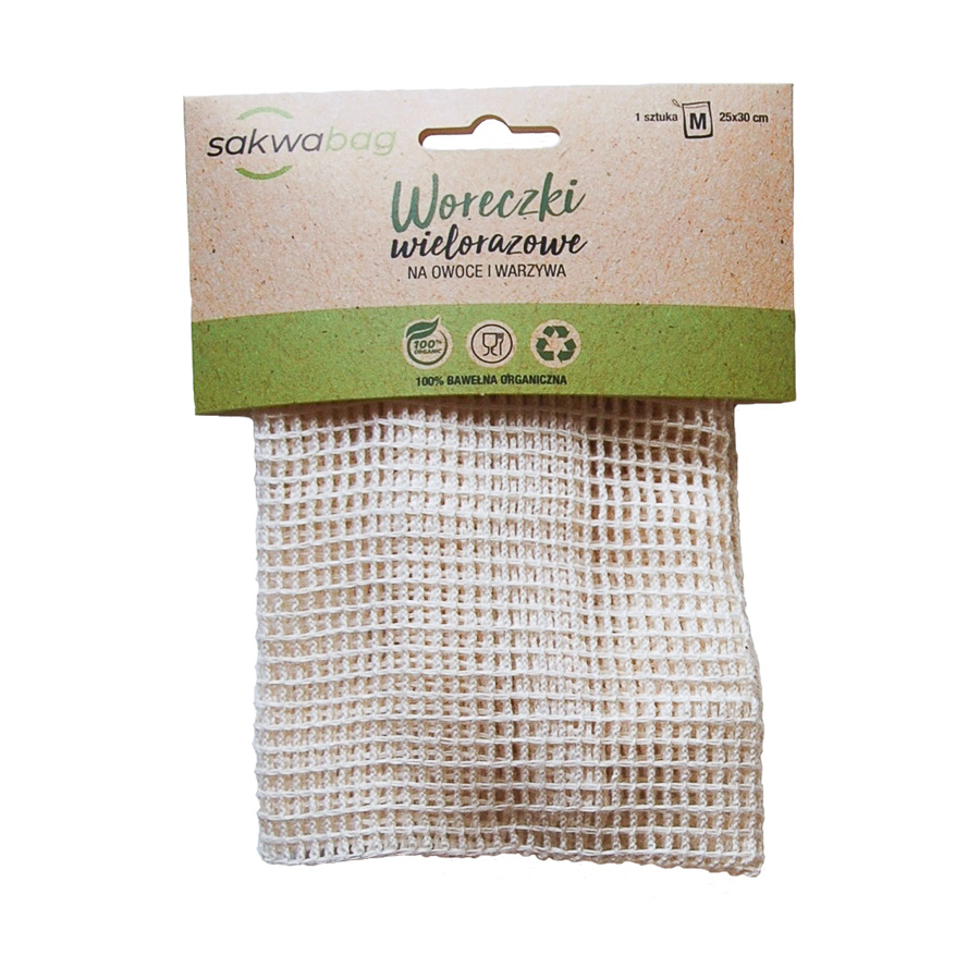 Wielorazowy woreczek na owoce i warzywa, wykonany w 100% z bawełny organicznej w rozmiarze M. Wymiar woreczka 25×30 cm. Woreczek pomieści około 2,5 kg produktów. Przedmiot wielokrotnego użytku, biodegradowalny. Produkt dopuszczony do kontaktu z żywnością przez Państwową Inspekcję Sanitarną.
