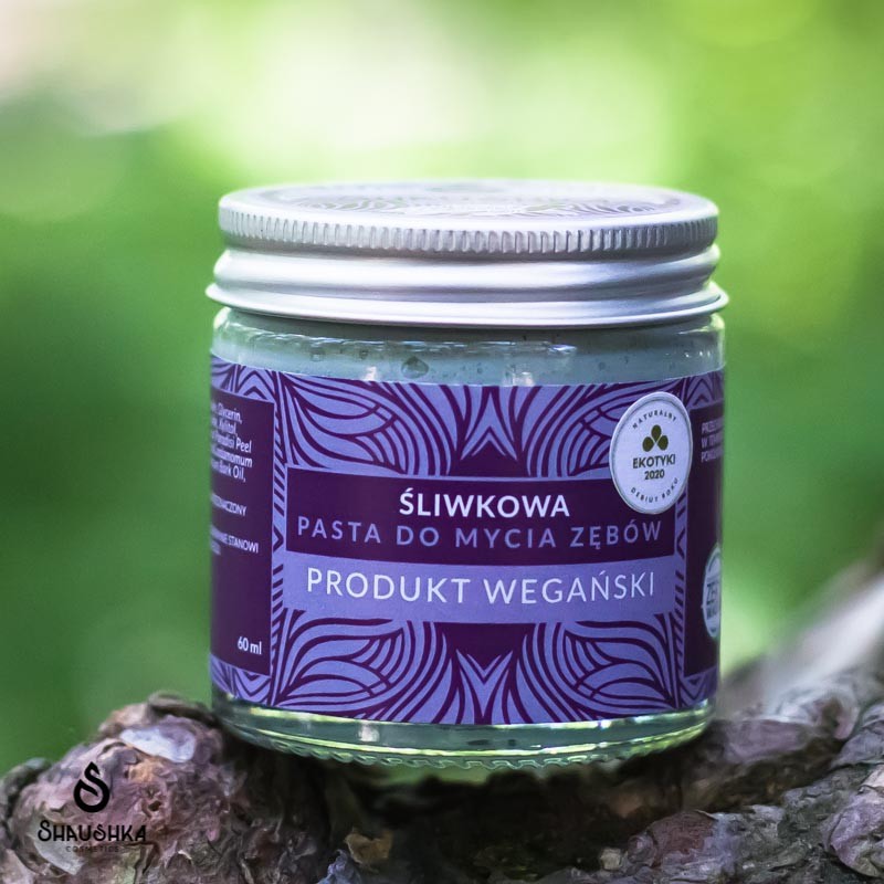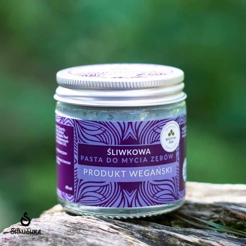 Śliwkowa pasta jest w 100% wegańska – ma w składzie roślinną glicerynę, naturalne glinki, olejki eteryczne oraz ksylitol brzozowy. W składzie znajduje się także niewielka ilość łagodnego glukozydu decylowego, który powstaje na bazie alkoholi oleju kokosowego.