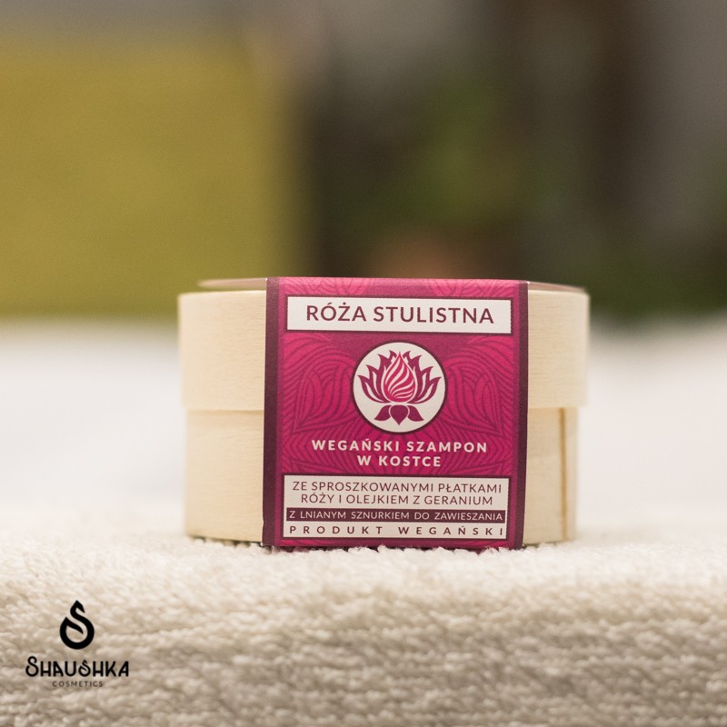 Szampon w kostce Róża stulistna to pięknie pachnący szampon w kostce. Zawiera w składzie proszek pozyskiwany z płatków róży stulistnej – źródło minerałów i witamin. Działa zarówno na wygląd, jak i dobre funkcjonowanie całego ciała. Polecamy do jasnych oraz do ciemnych, przetłuszczających się włosów. Dobrze się pieni i oczyszcza skórę, nadaje się do włosów średnio i niskoporowatych. Kobiecy zapach może być mylący, używa go również wielu mężczyzn.