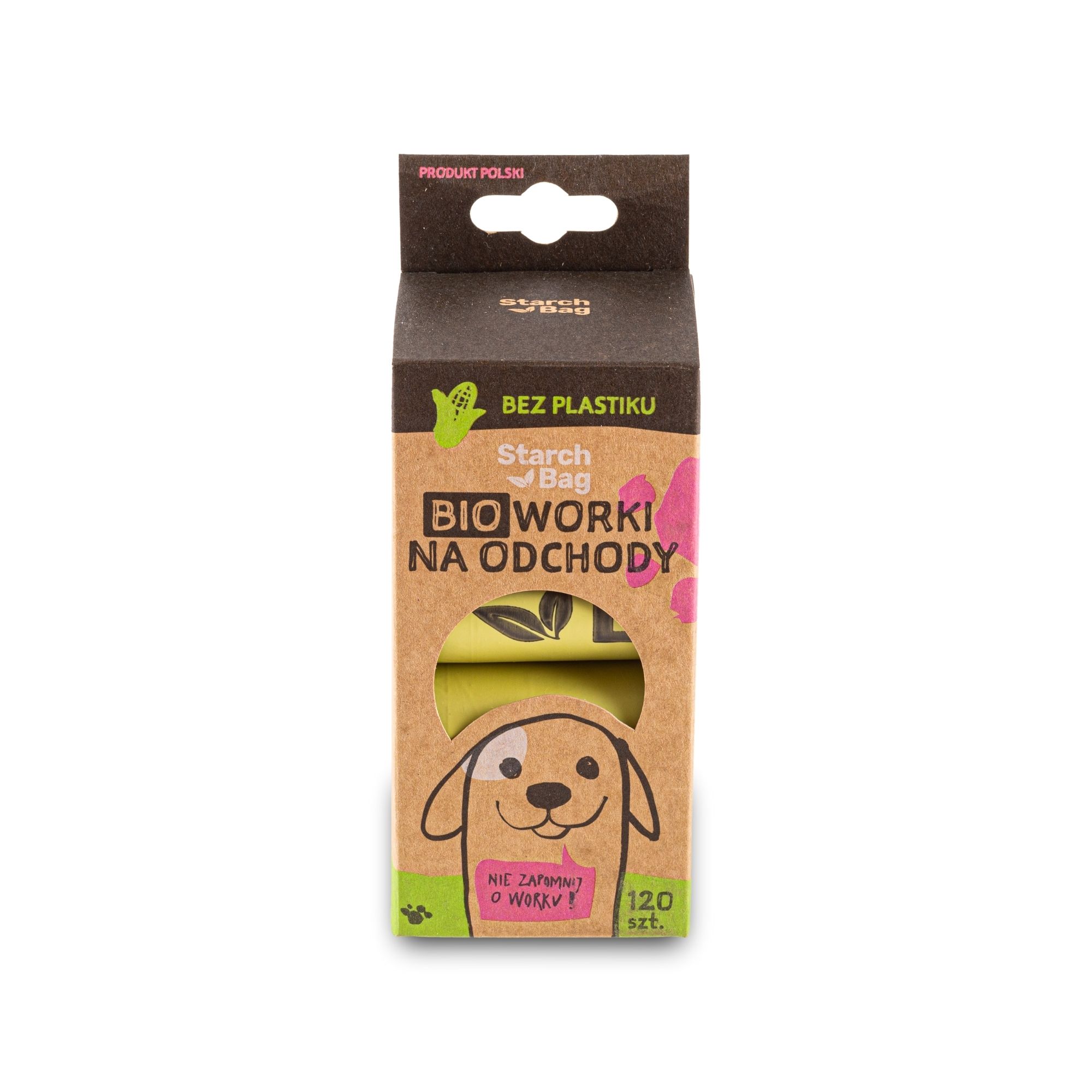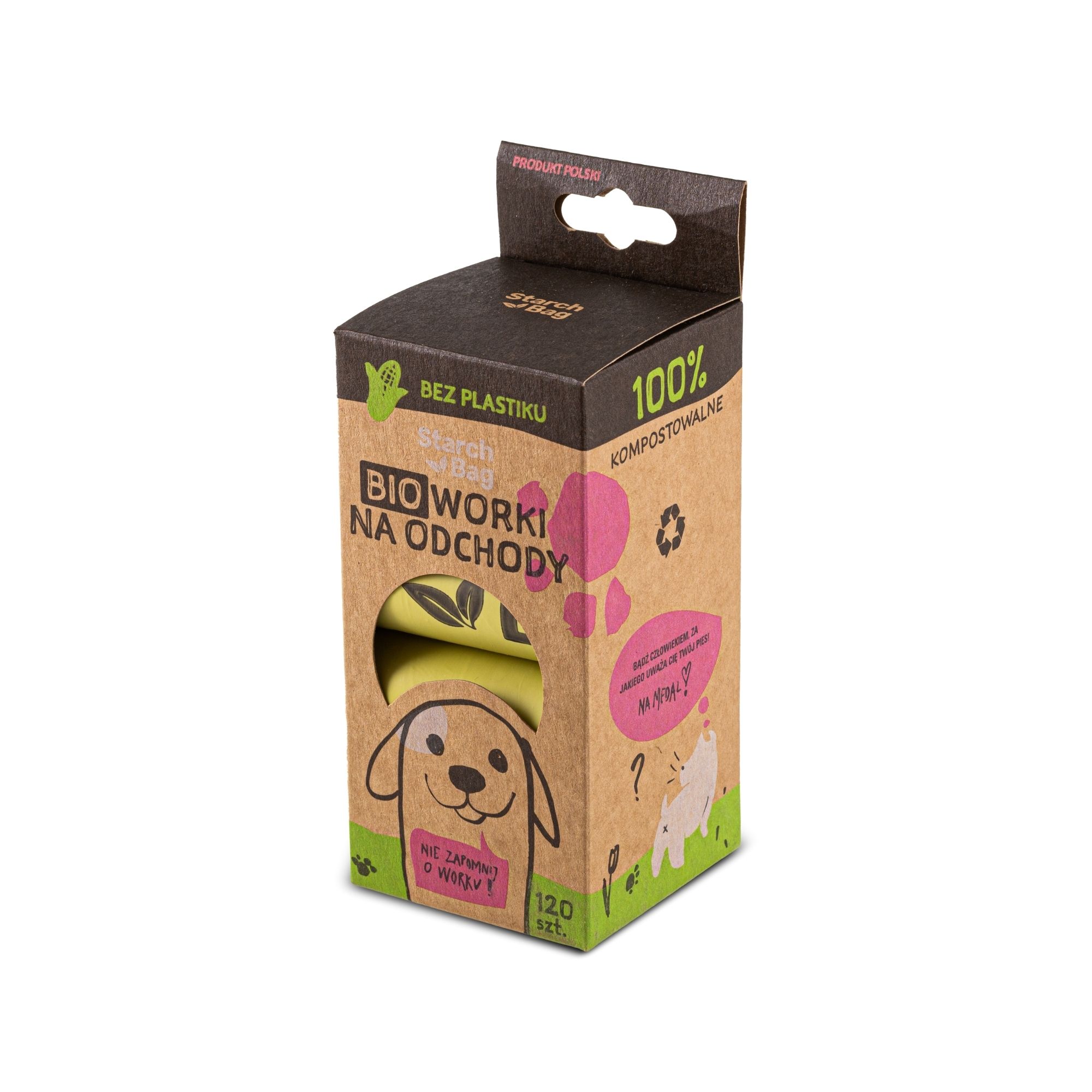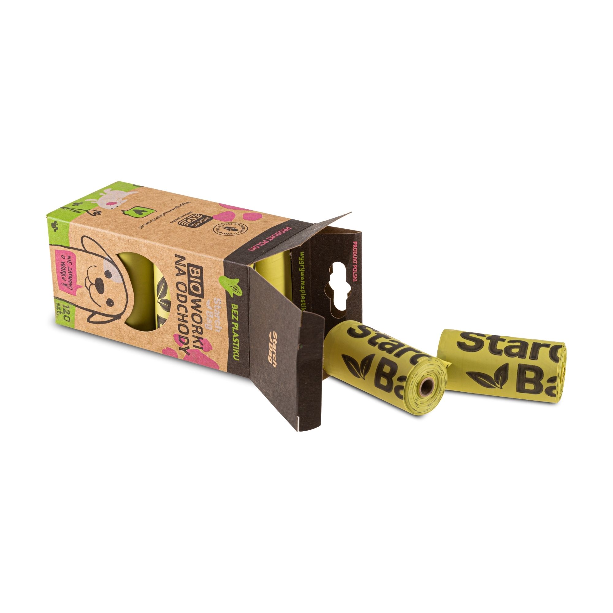 Worki na psie odchody StarchBag są w 100% biodegradowalne i kompostowalne. Ekonomiczny zestaw zawiera aż 120 woreczków i wystarcza średnio na 3 miesiące spacerów z pupilem.